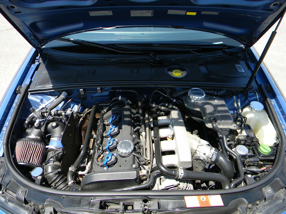 Stock 1.8T, K&N cold air intake, Giac software, APR exhaust, VHT wrinkle painted valve cover and ECS Tuning coil pack hold down kit.