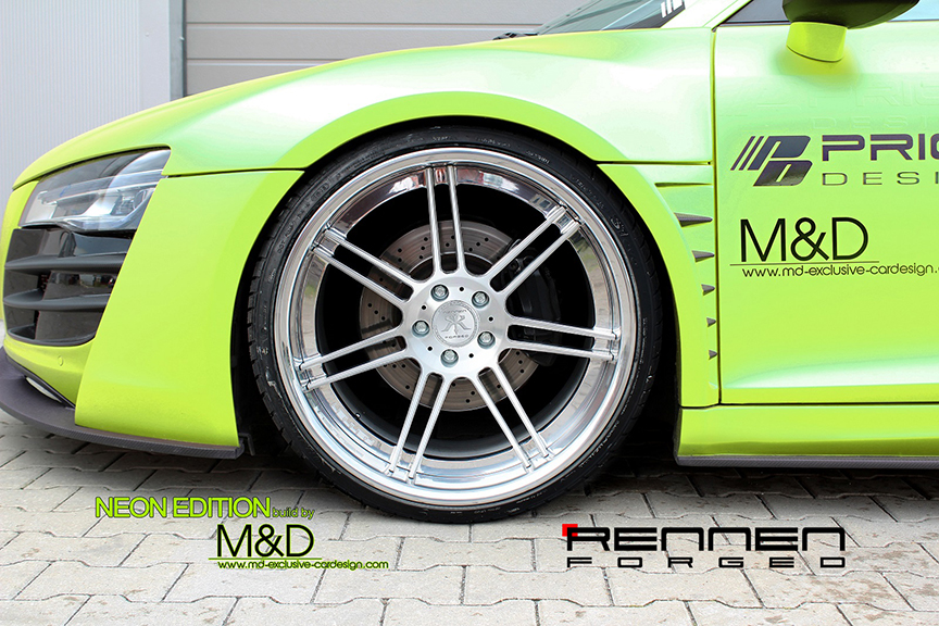 Staying true to our name, Rennen International has embarked on another over seas collaboration. For this Prior Design Widebody Audi R8 we teamed up yet again with Germany's Premier Car Builder, M&D Exclusive Car Design. As you will see, the quality of our teamwork speaks for itself….it will have you saying ich liebe Rennen! These Forged Rennen R7 Concave wheels are staggered at 20x10"f and 20x13.5"r, with Brush finish and High Polish Lip they are the perfect final addition to this multicultural masterpiece! Prost!
