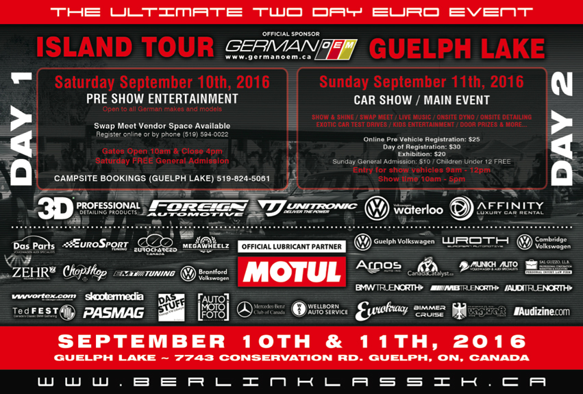 We are pleased to announce our new venue location located at Guelph Lake on the ever so spectacular island. This new venue will bring a breath taking view for all show goers! Berlin Klassik’s mantra is to attract enthusiasts, both local and from abroad, to come out and see what Euro car enthusiasts have to offer.