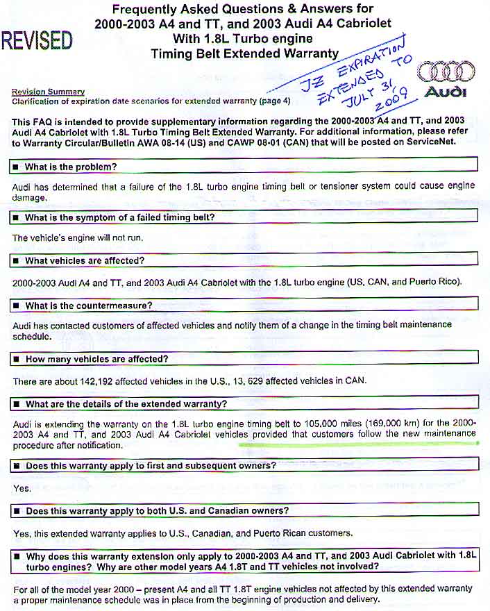 Basically in Canada, Audi has not admitted to any fault yet on the timing belt, but simply stated that they had misprinted the service interval for the timing belt, and as such will extend warranty to 169,000km for the timing belt.