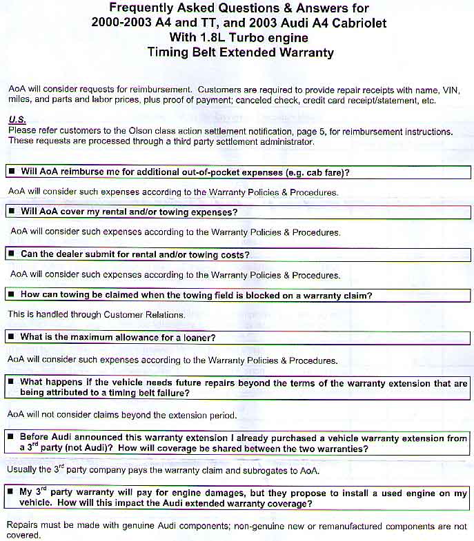 Attached is the 4-page "FAQ" that I received from the service manager from Againcourt Audi when I asked them about what is Audi of Canada doing with regards to the Timing Belt lawsuit in the U.S.